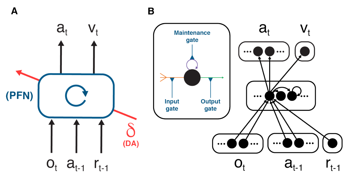 - Architecture: The prefrontal network (PFN), including sectors of the basal ganglia and the thalamus that connect directly with PFC, is modeled as a RNN, with synaptic weights adjusted through an RL algorithm driven by dopamine (DA). o = perceptual input. a = action. r = reward. v = state value. δ = reward prediction error (RPE)