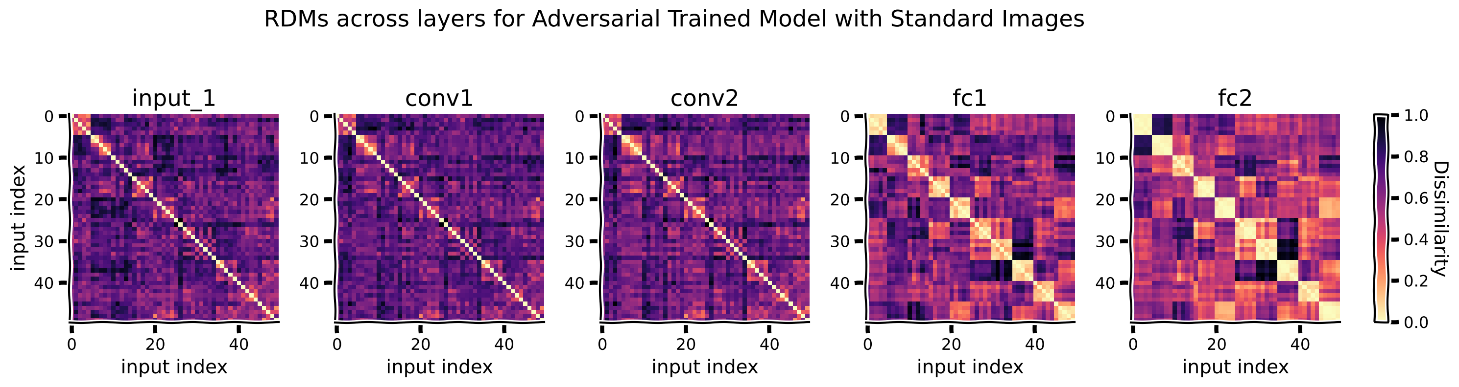 - calculate RDMs based on the Euclidean distances between the representations of inputs (for each layer): $ M(\text{layer}_k, x_i, x_j) $