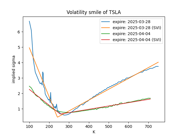 - 首先根据真实数据画图理解 Volatility Smile, 并进行了 SVI (Stochastic Volatility Inspired) 模型拟合