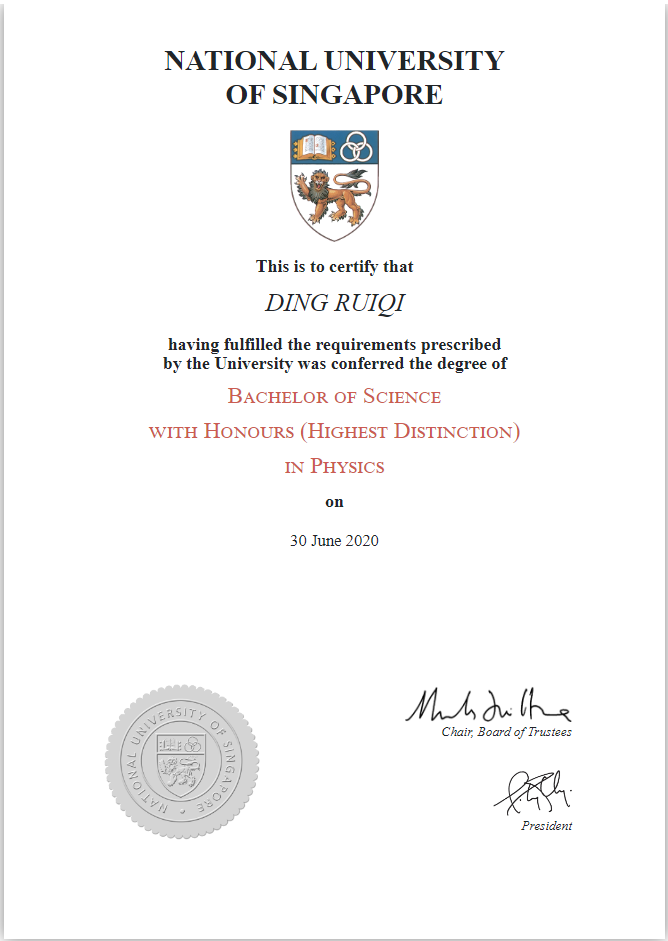 Degree: Bachelor of Science (Honours, Highest Distinction) in Physics