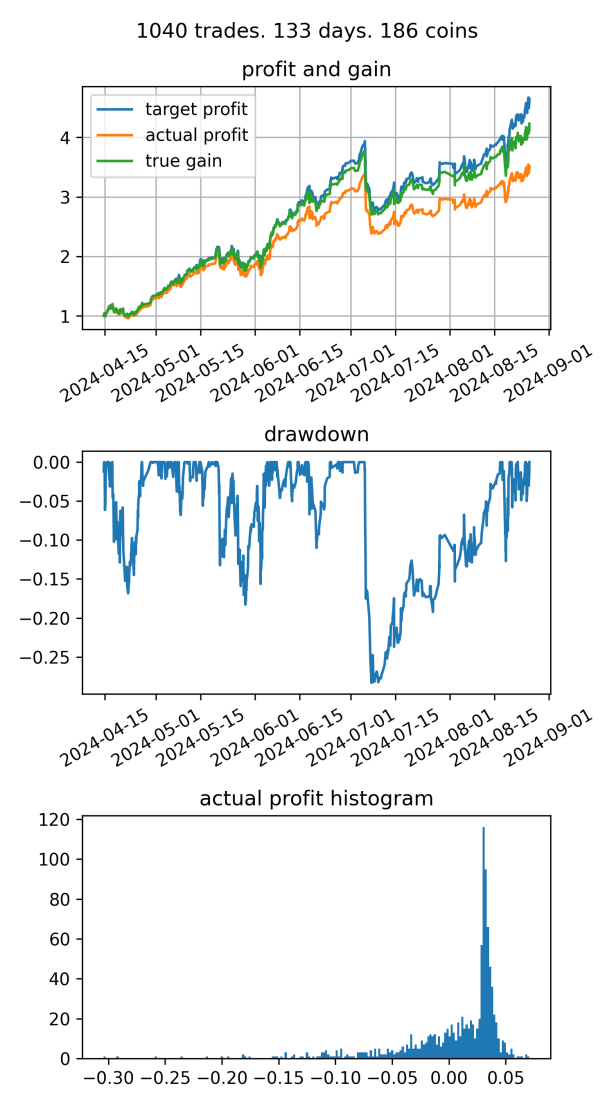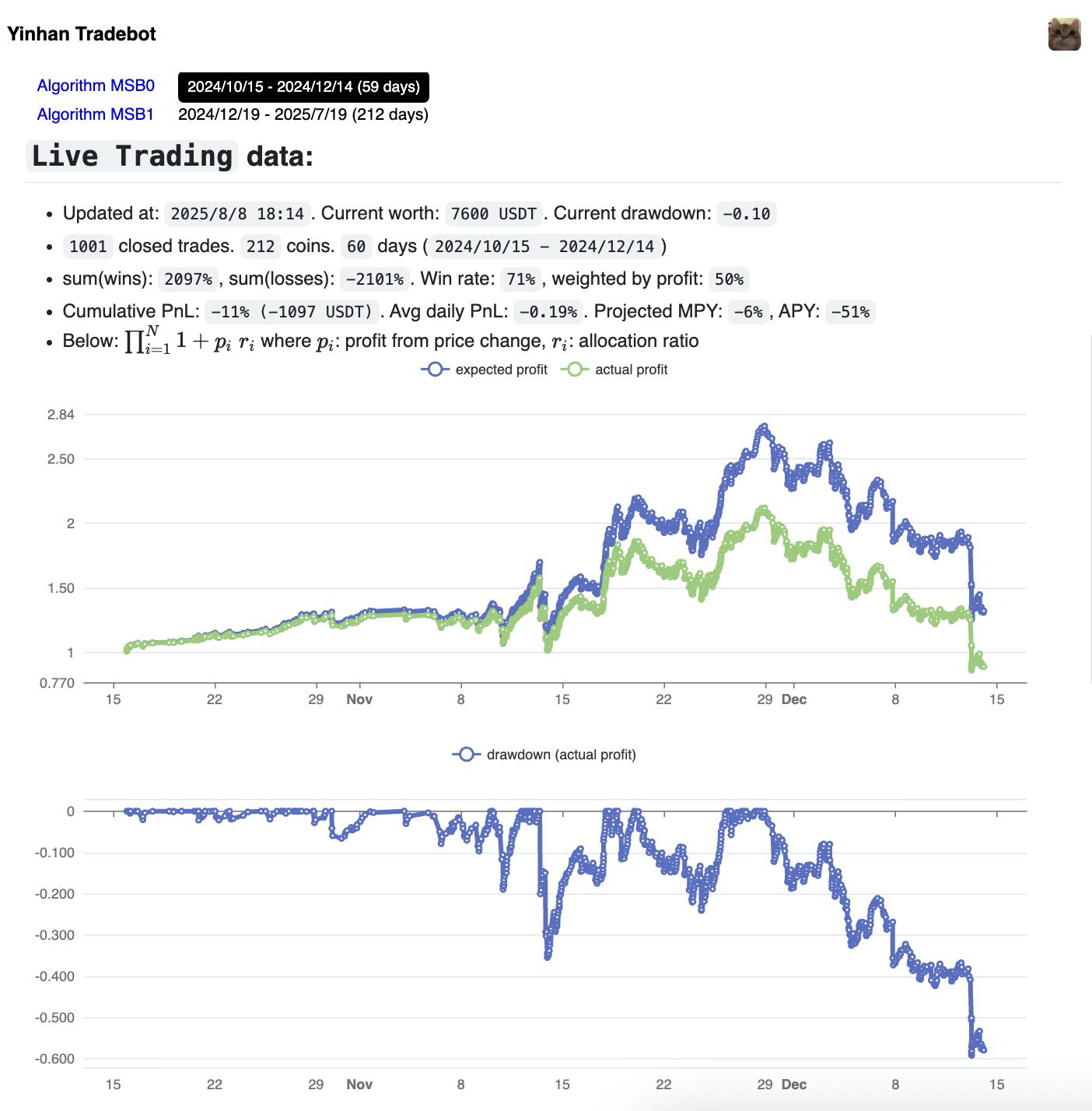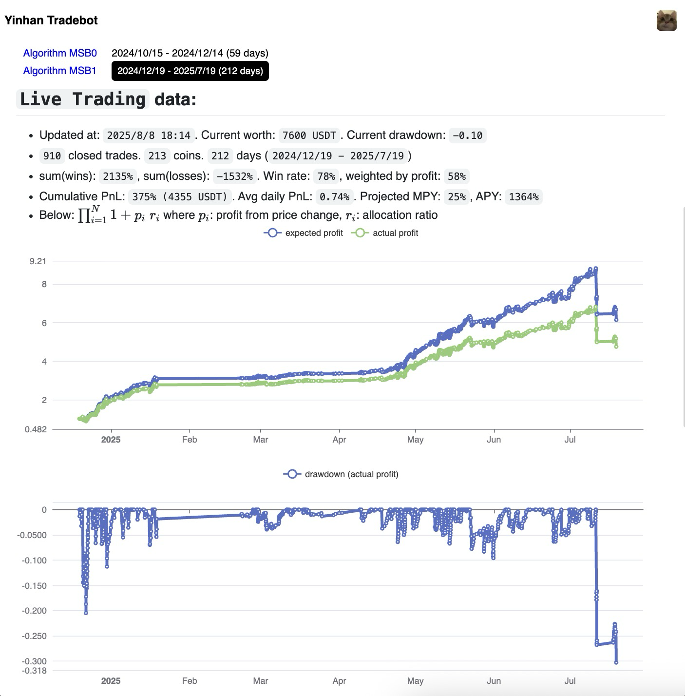 2024-12-19-2025-07-19: I switched to algorithmMSB1, it has the same mechanism asMSB0, but with much safer parameters. It performed steadily for 6 month, achieving+600%profit, until it crashed with a-30%drawdown in July 2025.I decided to stop the bot after the