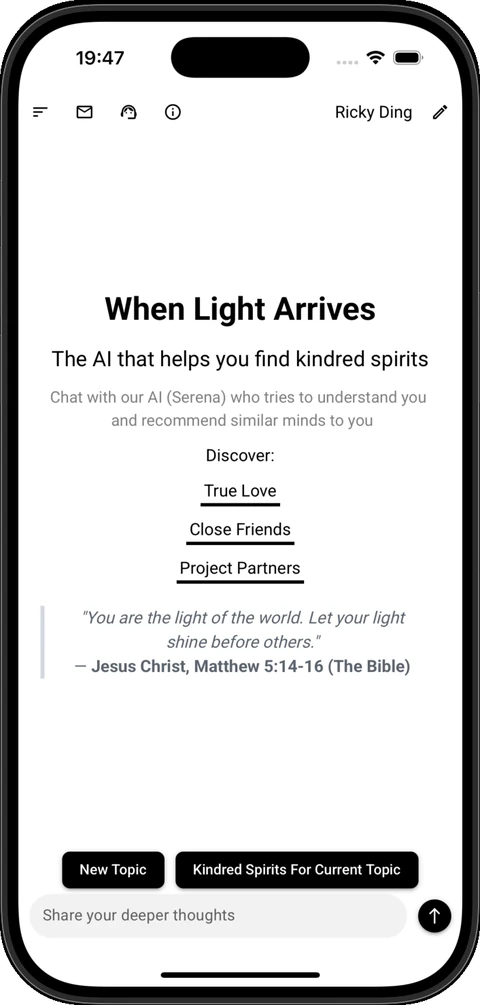 When Light Arrives, trying to be poetic, depictingkindred spiritsaslights that are about to arrive, but it is too long, and non-intuitive about what the app really does. Similar Mindswill be the successor with the same idea, but better name, logo and designs.