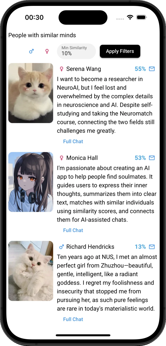 See Your Matches: Filter for the most similar minds, read their full chats with Serena