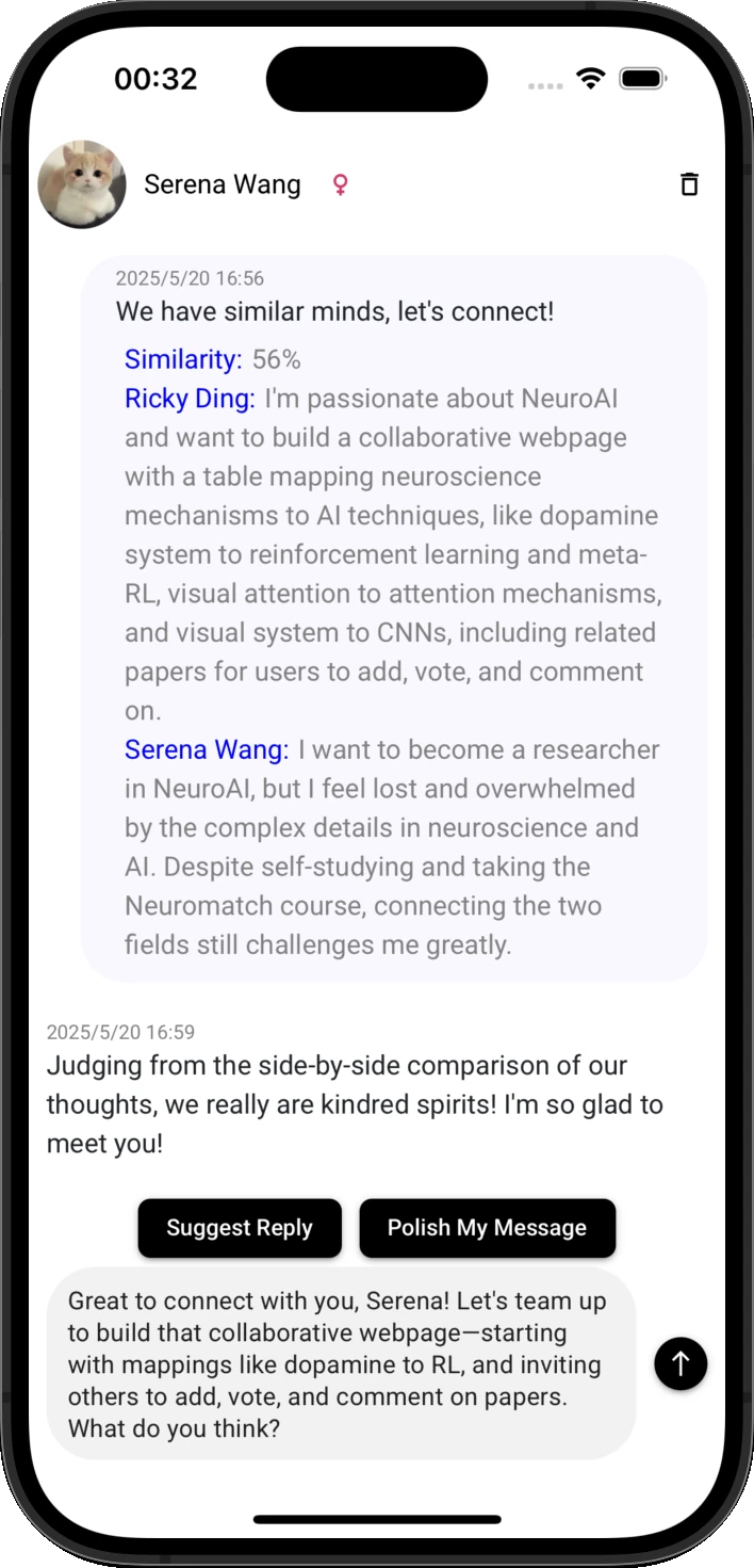 Chat with Kindred Spirits. Shy? Serena guides you to chat and polishes your messages
